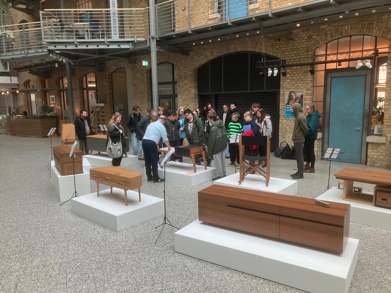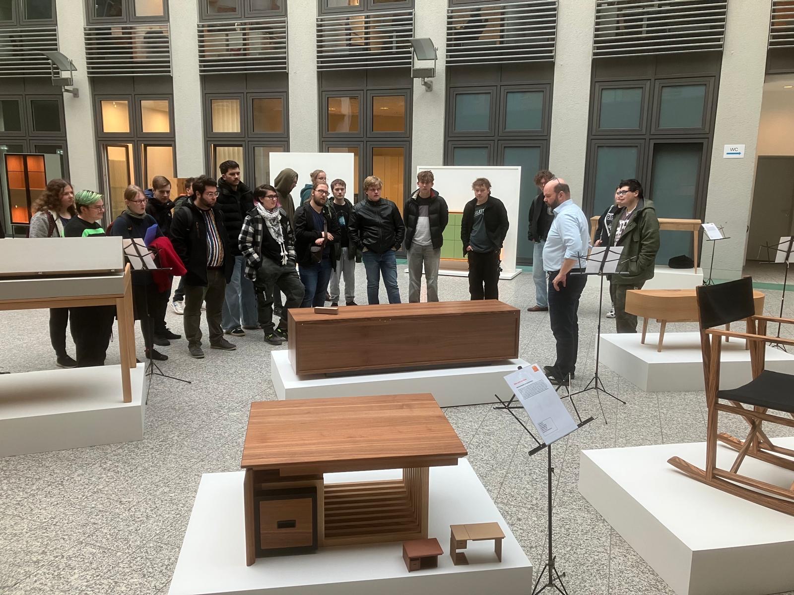 Im Dezember starteten alle Tischlerklassen des Euro-BBW gemeinsam mit ihren Ausbildern und Klassenlehrer*innen zum Wettbewerb „Die Gute Form“ nach Mainz. Dort wurden die besten Gesellenstücke aus Rheinland-Pfalz des Jahrgangs 2025 ausgestellt.
