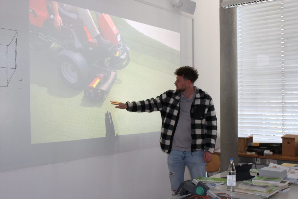 Mittlerweile zum Greenkeeper fortgebildet leitet er die Rasen- und Grünpflege im Golfclub Eifel in Hillesheim. Sein Spezial-Wissen zur Pflege von Greens, Fairways und Bunker teilte er mit den aktuellen Auszubildenden im Gartenbau. Kaum zu glauben, dass Rasen tatsächlich auf 2,7 mm runtergeschnitten werden kann. Gut, dass wir das bereits letztes Jahr beim Besuch des Golfplatzes bewundern konnten, sonst hätten wir es uns nicht vorstellen können.