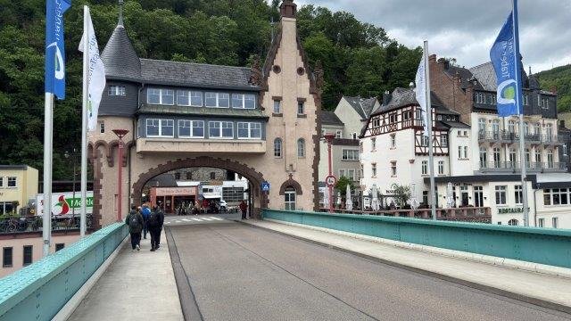 Im Panorama-Restaurant auf der anderen Moselseite in Trarbach haben wir uns mit schönem Blick auf die Mosel und den Stadtteil Traben gestärkt. Auf dem Hin- und Rückweg dorthin konnten wir das Brückentor von Traben-Trarbach – dem Wahrzeichen der Stadt – bewundern, das nach Plänen von dem Berliner Architekten Bruno Möhring um die Jahrhundertwende im Jugendstil erbaut wurde. Bei einem Bummel durch Traben-Trarbach wechseln sich Baudenkmäler aus der Jugendstilzeit mit barocken und klassizistischen Bauten sowie typisch moselländischer Architektur und ist absolut eine Reise wert.