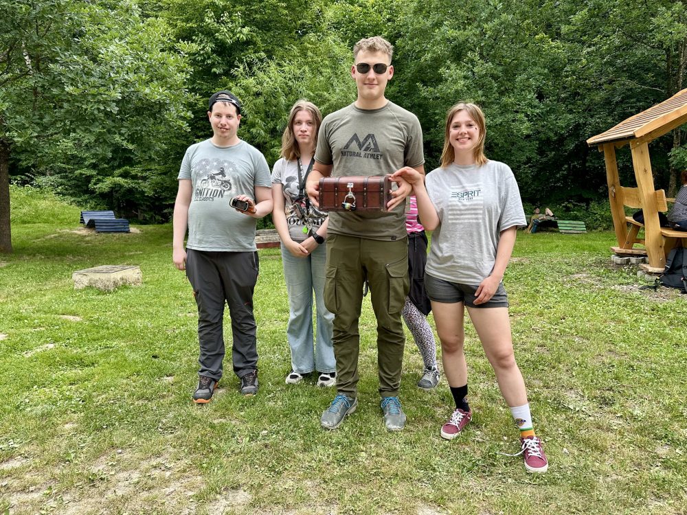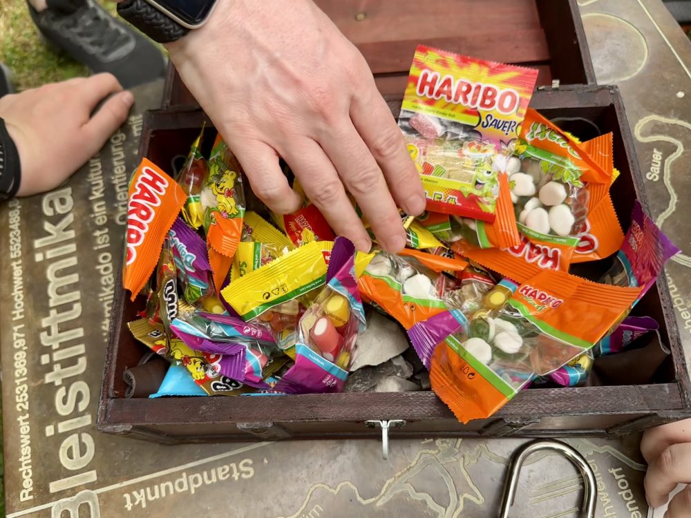 Ausgestattet mit GPS-Geräten begaben sich die Teilnehmenden auf Schatzsuche. Dabei mussten sie knifflige Hinweise entschlüsseln und verschiedene Stationen finden. Die Freude war groß, als der Schatz schließlich entdeckt wurde. In einer verschlossenen kleinen Kiste warteten bunte Gummibärchen, interessante Fossilien und funkelndes Katzengold auf die Gruppen.