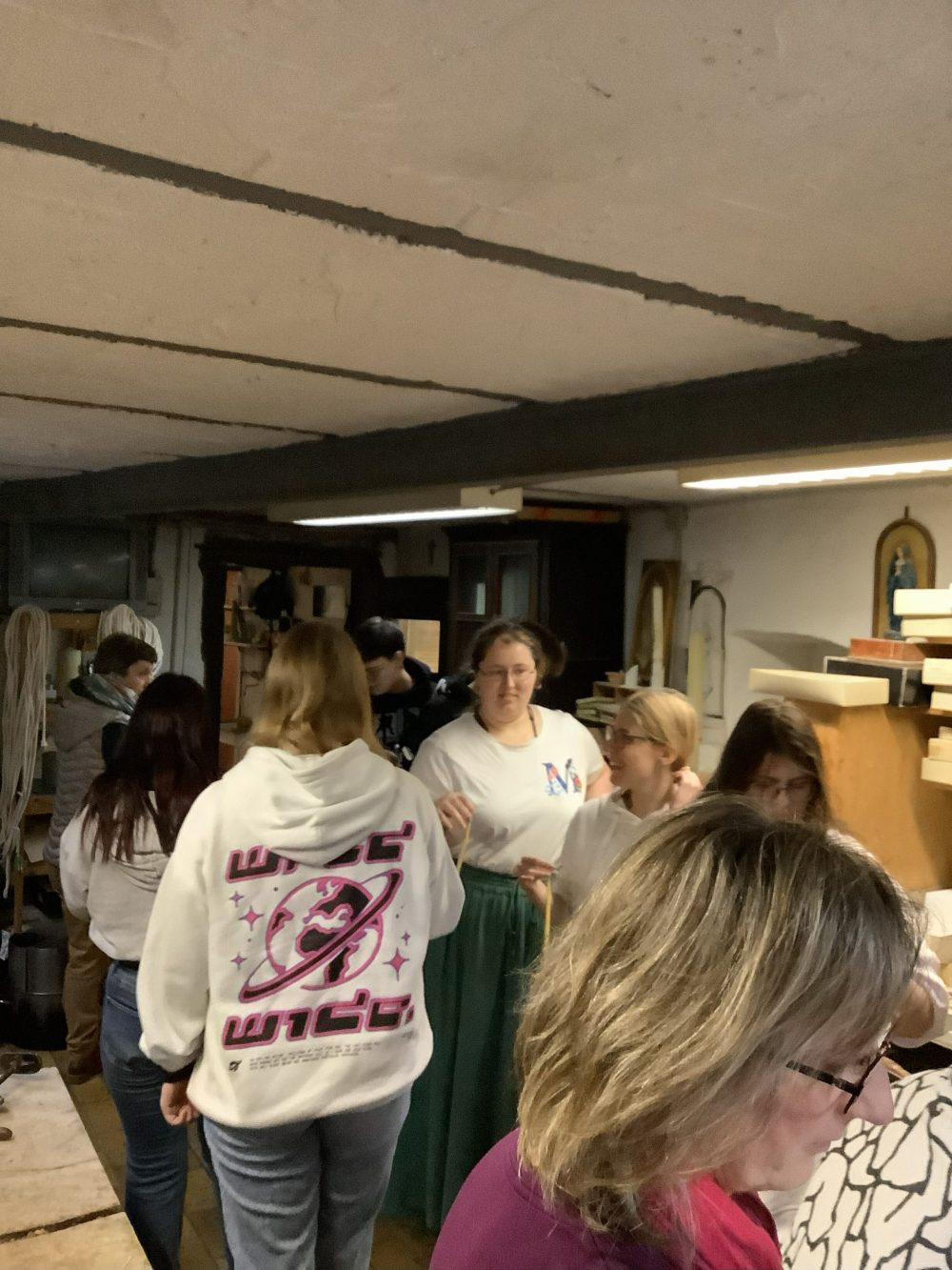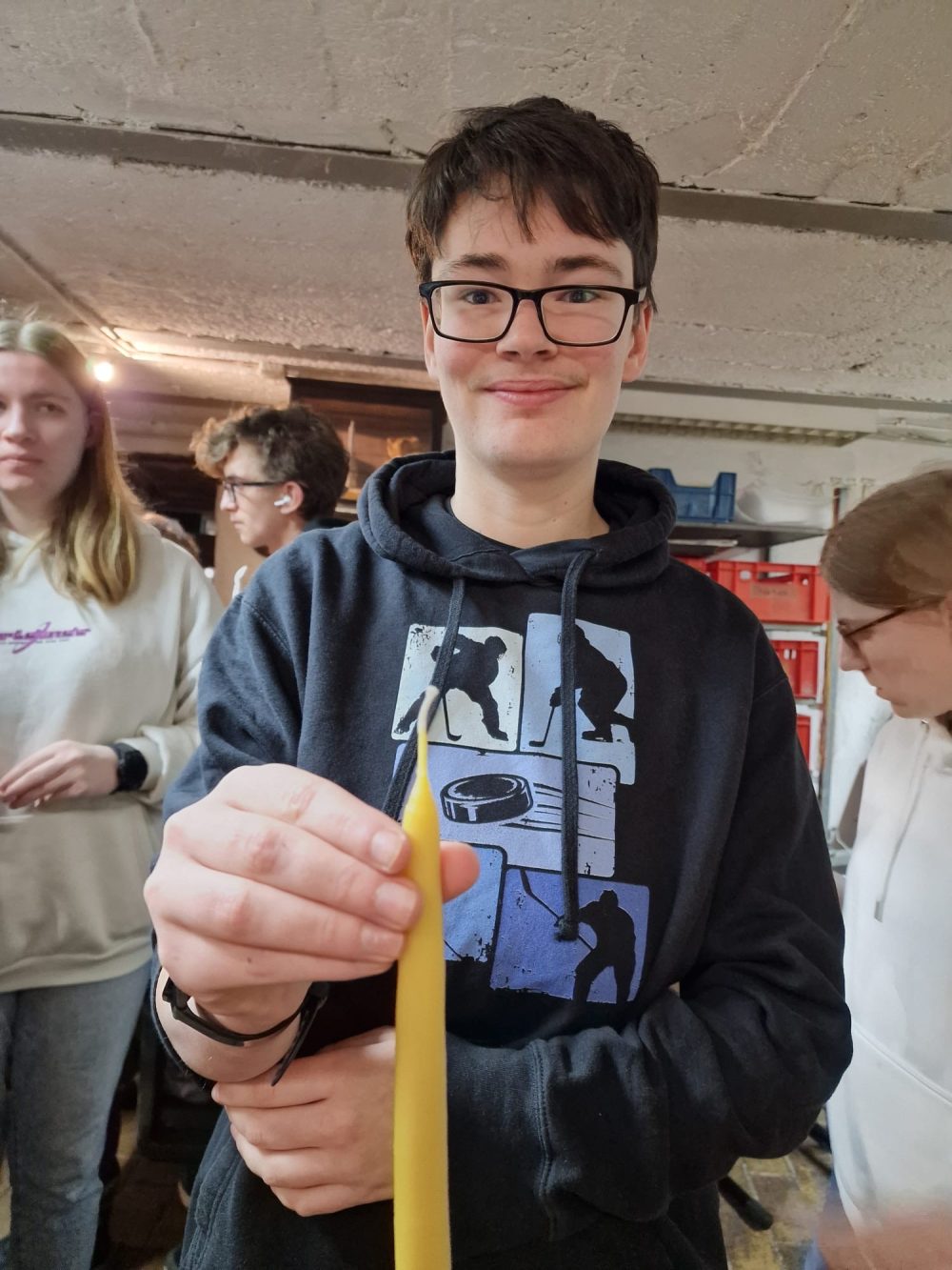 „Es ging nach Manderscheid in die Kerzenmanufaktur Moll. Dort machten wir zwei verschiedene Arten von Kerzen. Die Bienenwachskerzen wurden durch mehrmaliges Eintauchen hergestellt, wobei wir darauf achten mussten, dass wir die Kerzen nicht versehentlich versenken. Aber Frau Schreiber hat es geschafft 🙂 Im 2. Teil unseres Workshops modellierten wir tolle Kerzen aus Wachsplatten.