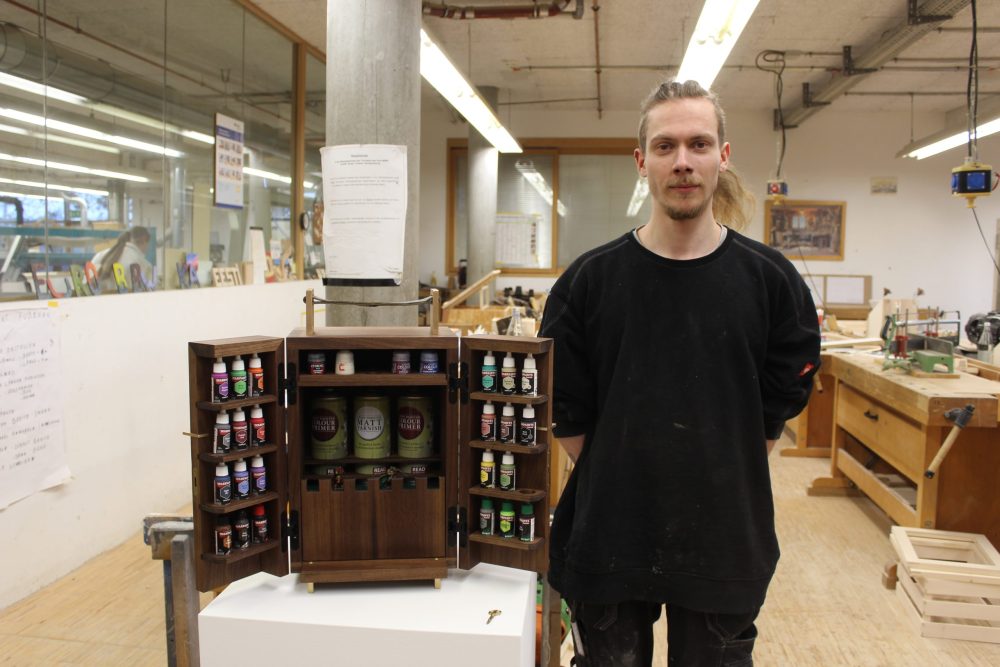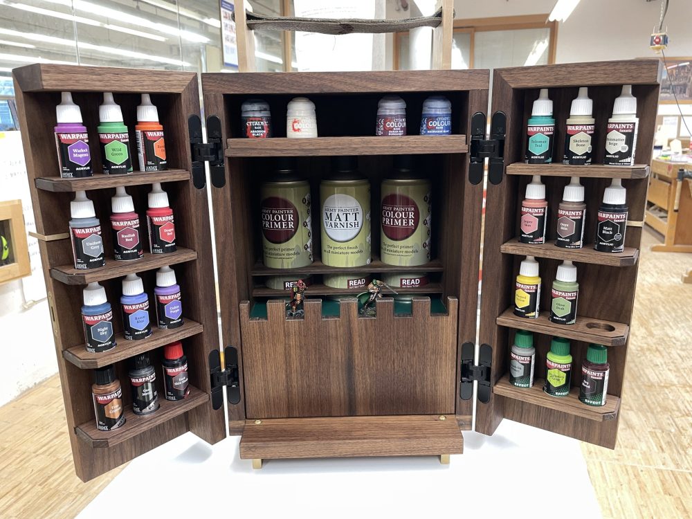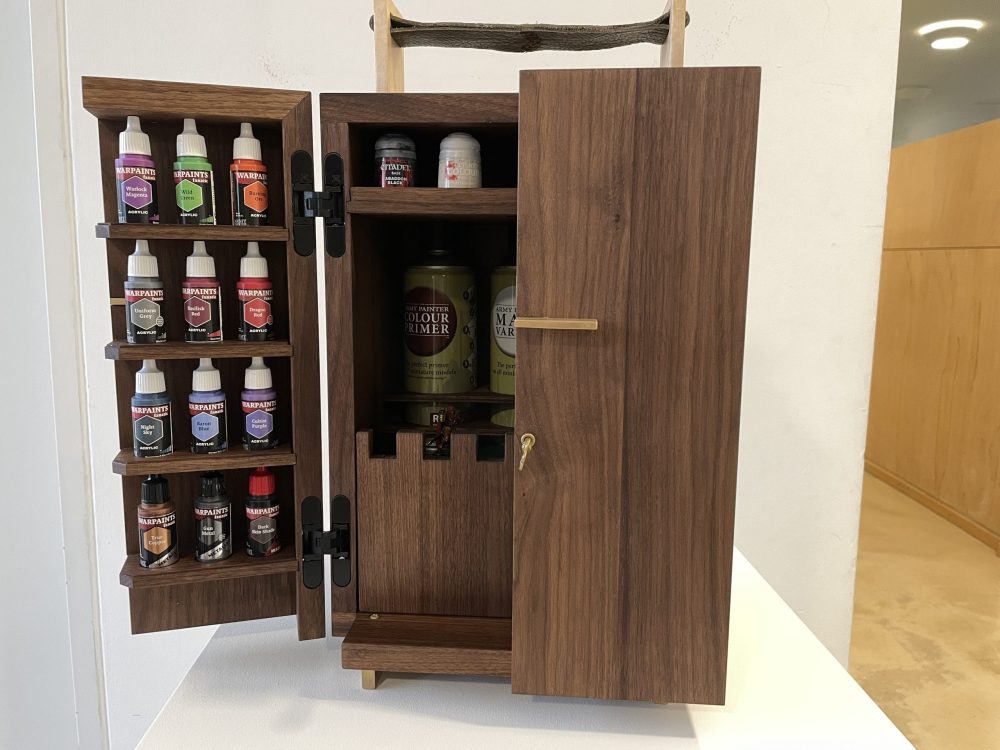 Das Gesellenstück für die Winterprüfung ist fertig. Unser Auszubildender Jan hat sich – passend zu seinem Hobby Miniaturenmalen – für ein PaintCasket (ein Aufbewahrungs-/Transportschränkchen) entschieden, in dem er seine Malutensilien aufbewahren und transportieren kann.