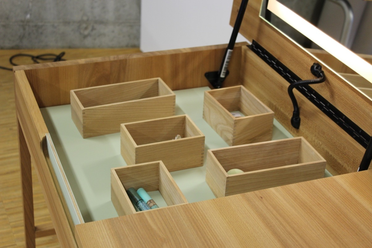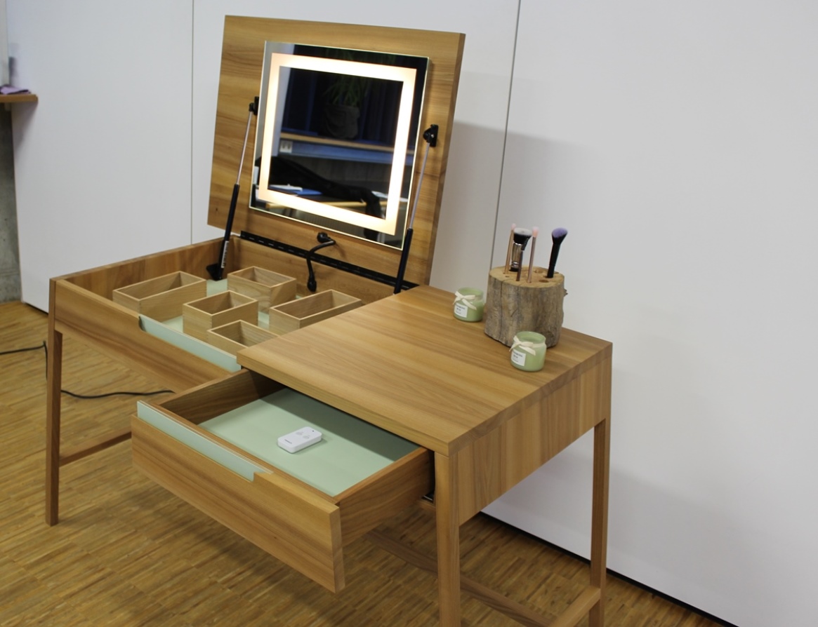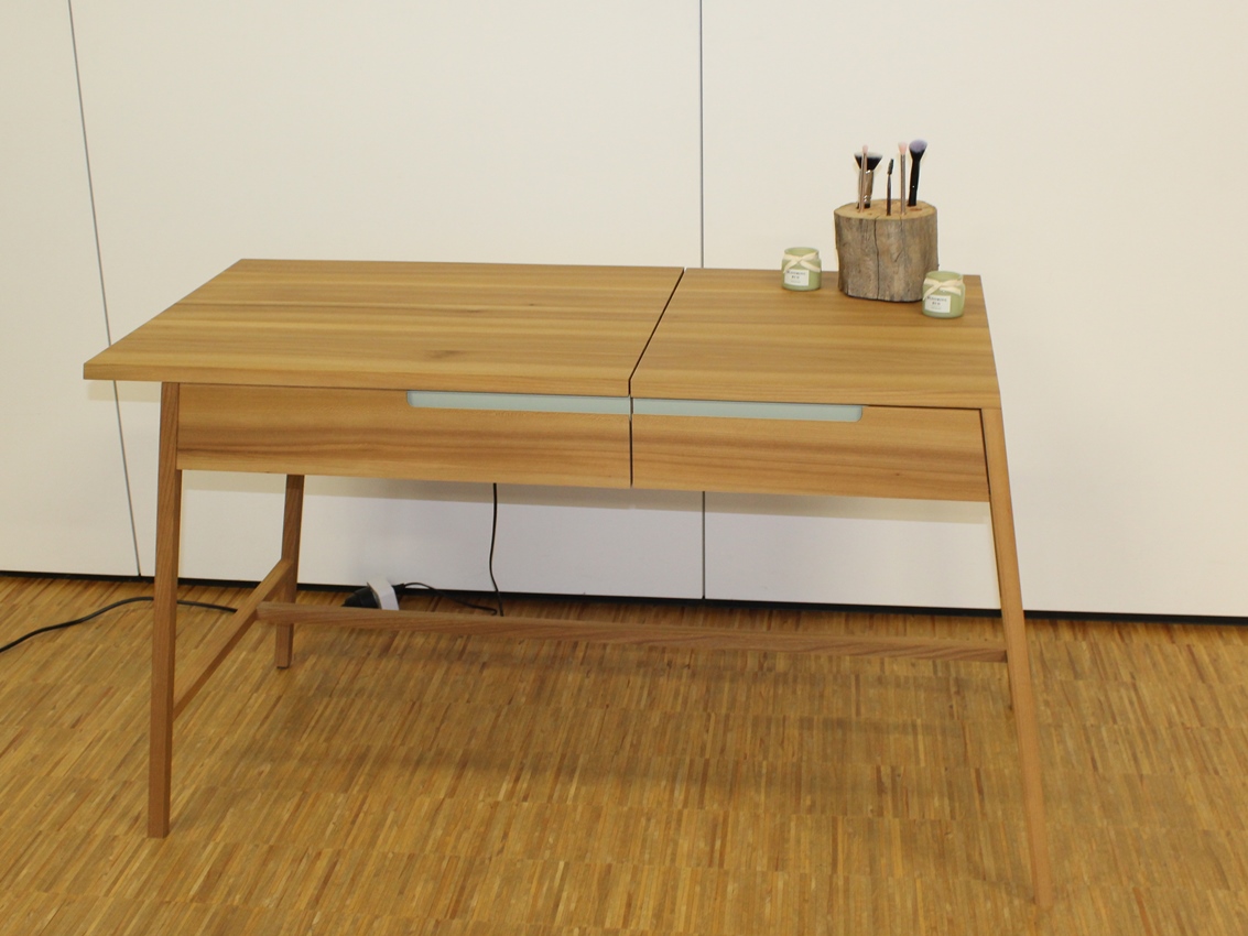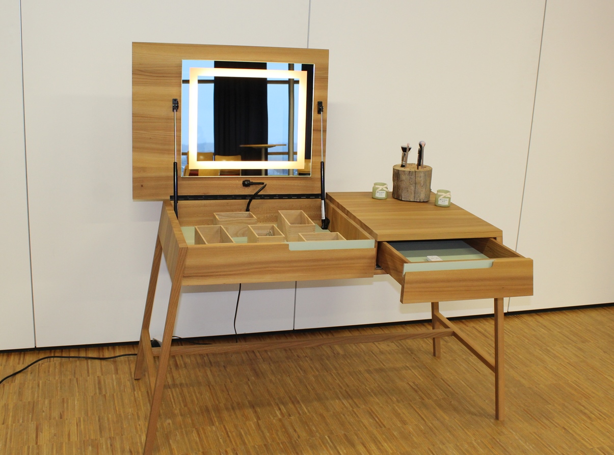 Ein Teil des Tisches lässt sich aufklappen und gibt den Blick frei auf einen großzügigen Innenraum zur Aufbewahrung von Kosmetikprodukten sowie auf einen beleuchteten Spiegel. Im Schubkasten mit mechanischem Vollauszug befindet sich eine Fernbedienung zur Steuerung des Spiegellichts. Die Böden aller Innenräume sind aufgrund seiner pflegeleichten Eigenschaft mit grünem Linoleum ausgelegt. Frau Tölkes hat für den Korpus des Schminktisches Rüsterholz aus ihrer Heimat verwendet und die Oberflächen nur mit einem Naturholzeffektlack behandelt, damit der natürliche Charme des Holzes erhalten bleibt. Mit diesem Schminktisch hat sie sich nicht nur ein praktisches Möbelstück, sondern auch einen echten optischen Hingucker geschaffen, mit dem sie sicher noch viel Freude haben wird!