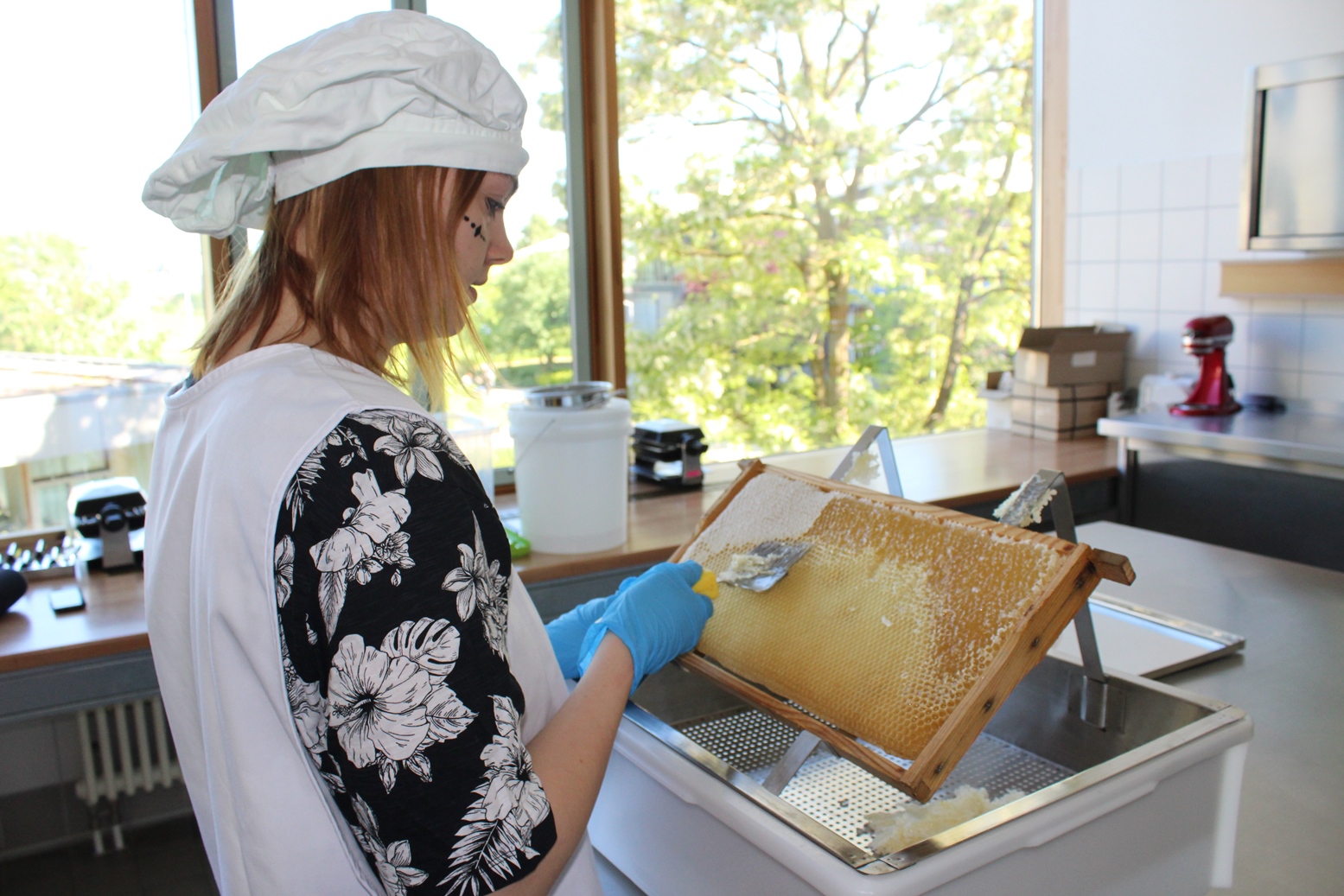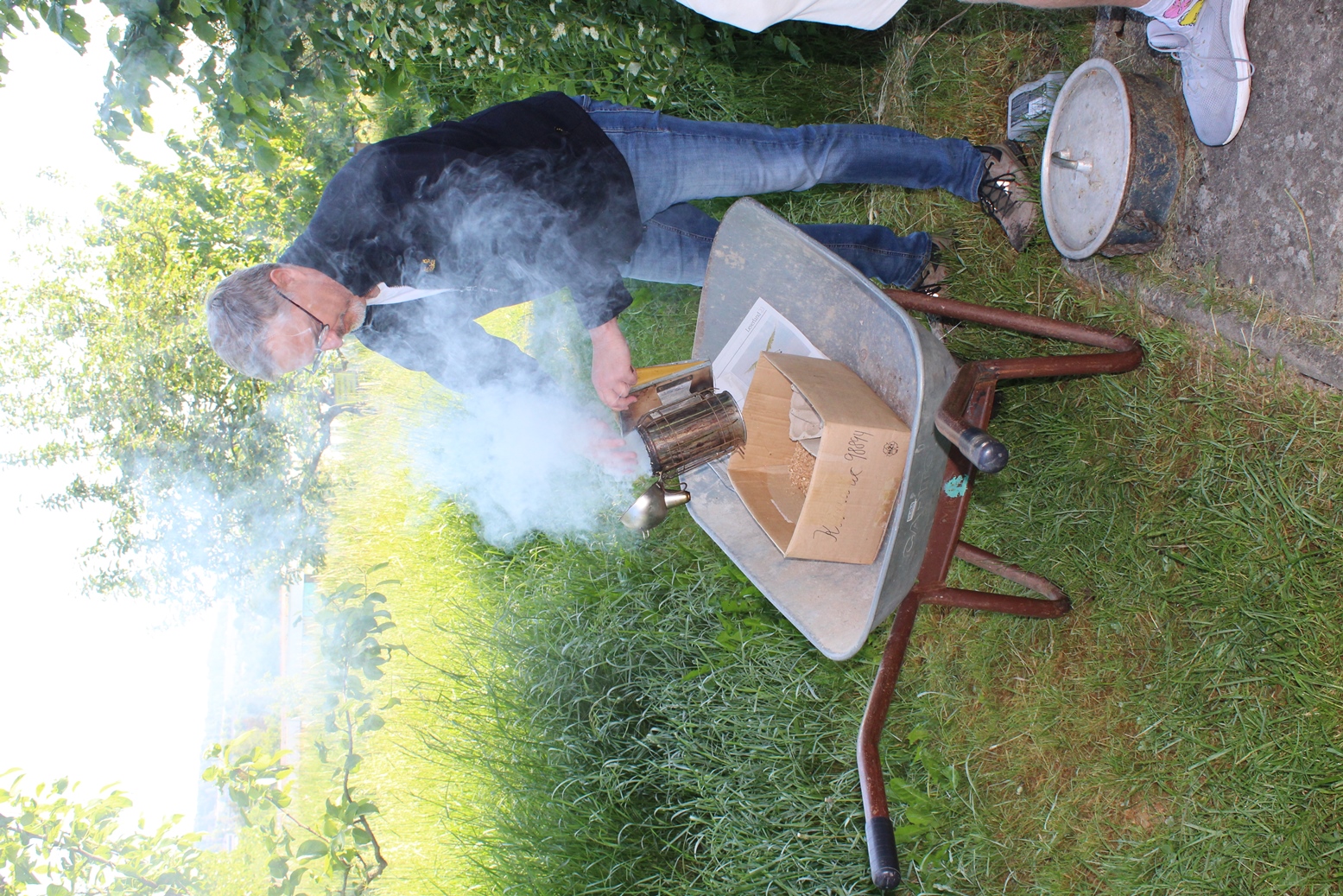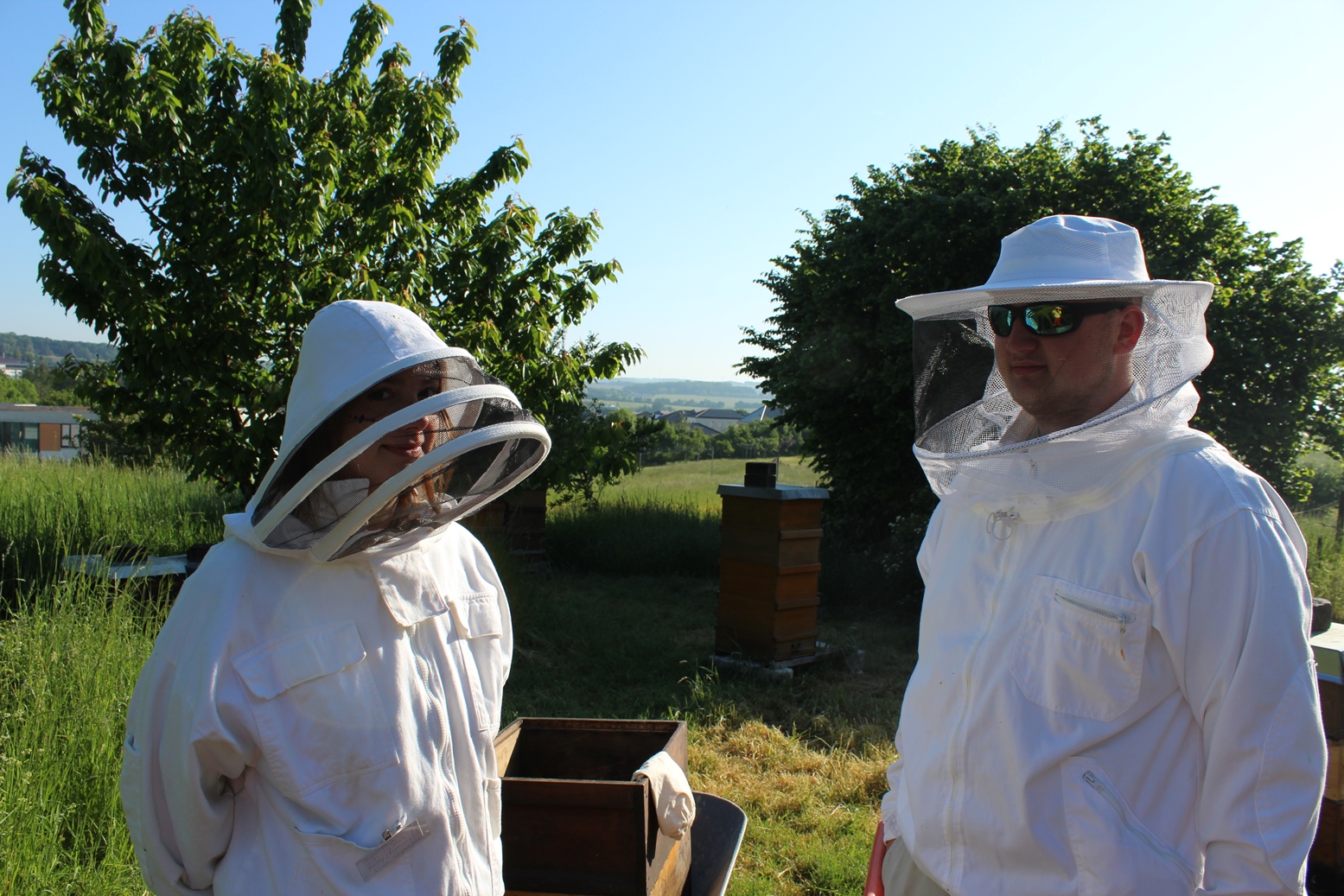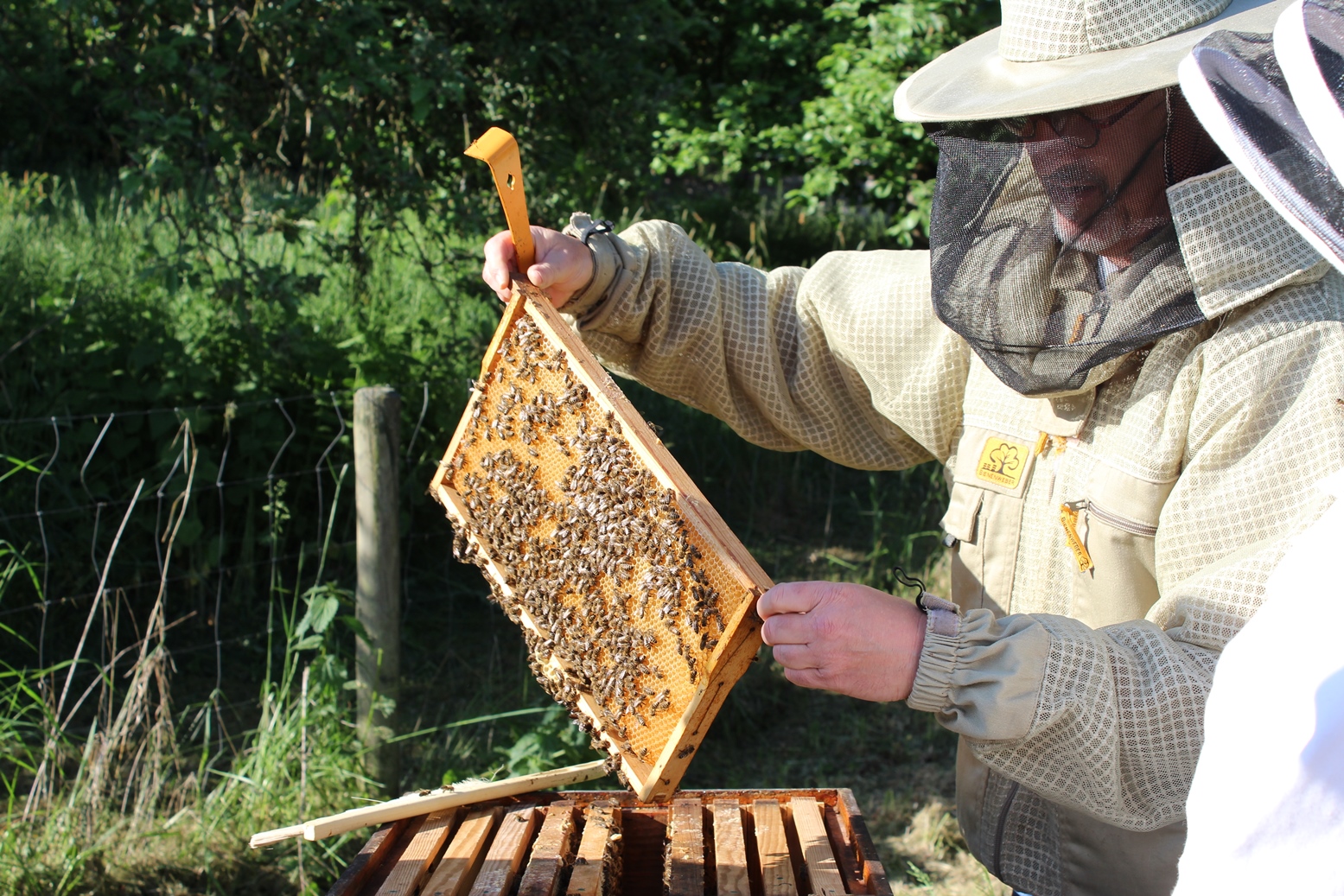 Bevor die Waben entnommen wurden, beruhigte Herr Holzkamp die Bienen mit einem Smoker. Der Rauch löst bei den Tieren einen Fluchtreflex aus, wodurch sie friedlicher werden. Anschließend wurden die Rähmchen kontrolliert: Nur wenn sie zu mindestens drei Vierteln mit weißem Wachs verdeckelt sind, ist der Wassergehalt des Honigs niedrig genug. In unserem Fall lag er bei idealen 15 %.