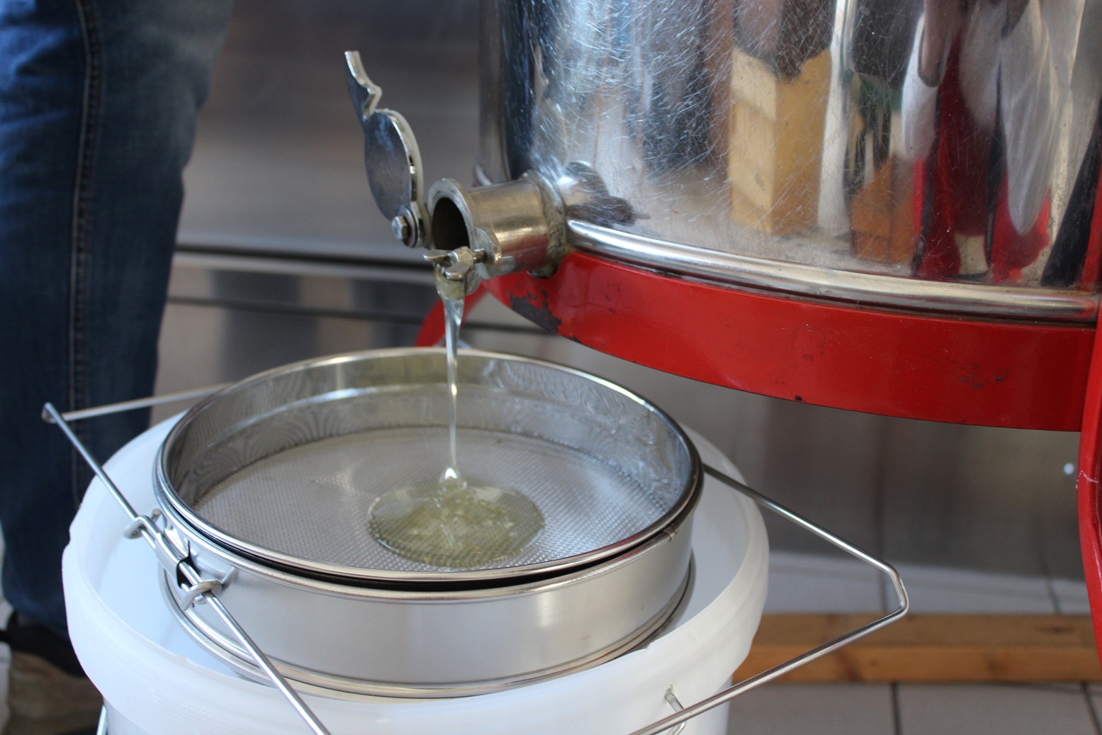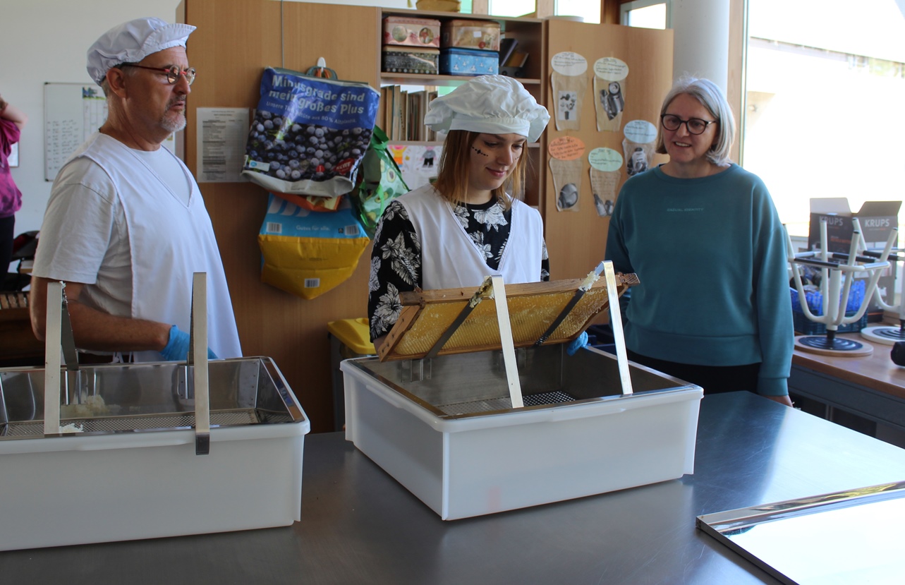 Die verdeckelten Waben wurden entnommen, die Bienen vorsichtig abgefegt und die Rähmchen zur BvB-Küche gebracht. Dort begann der nächste Schritt: das Entdeckeln. Mit einer speziellen Gabel wurde die dünne Wachsschicht entfernt, bevor die Waben in die Honigschleuder kamen. Durch die Rotation wurde der Honig herausgeschleudert und über ein Sieb in den Auffangbehälter geleitet. Sowohl beim Entdeckeln als auch beim Honigschleudern haben sich unsere Teilnehmenden abgewechselt, so dass jede/r alle Arbeitsschritte durchlaufen konnte.