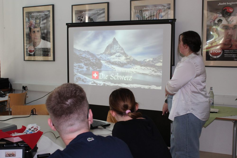 Zunächst begann Sarah mit einem Überblick über die geografischen und kulturellen Besonderheiten der Schweiz, die Größe des Landes und seine Bevölkerungsdichte. Dann stelle sie die wichtigsten Städte wie Zürich, Genf, Basel, Bern und Lausanne anhand von Fotos vor. Auch die beeindruckenden Seen, darunter der Genfersee, der Zürichsee und der Bodensee, fanden Erwähnung.