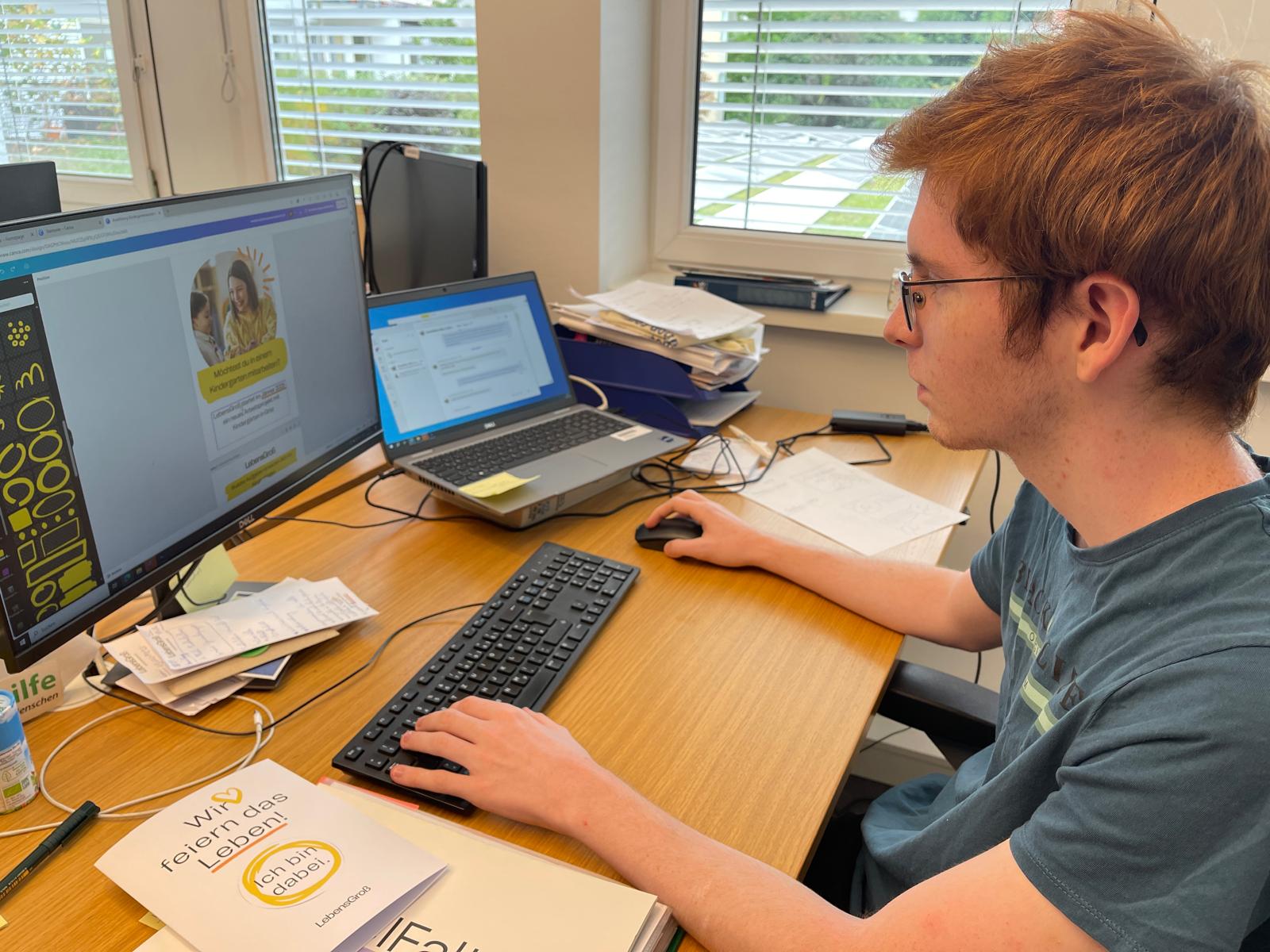 Am Montag starteten dann auch schon die Praktika: Dominik arbeitete in der Marketingabteilung des Vereins LebensGroß und setzte gemeinsam im Team Social Media Posts um und gestaltete Flyer. LebensGroß bietet wie der deutsche Verein Lebenshilfe Angebote für Menschen mit Behinderung in verschiedenen Lebensbereichen an.