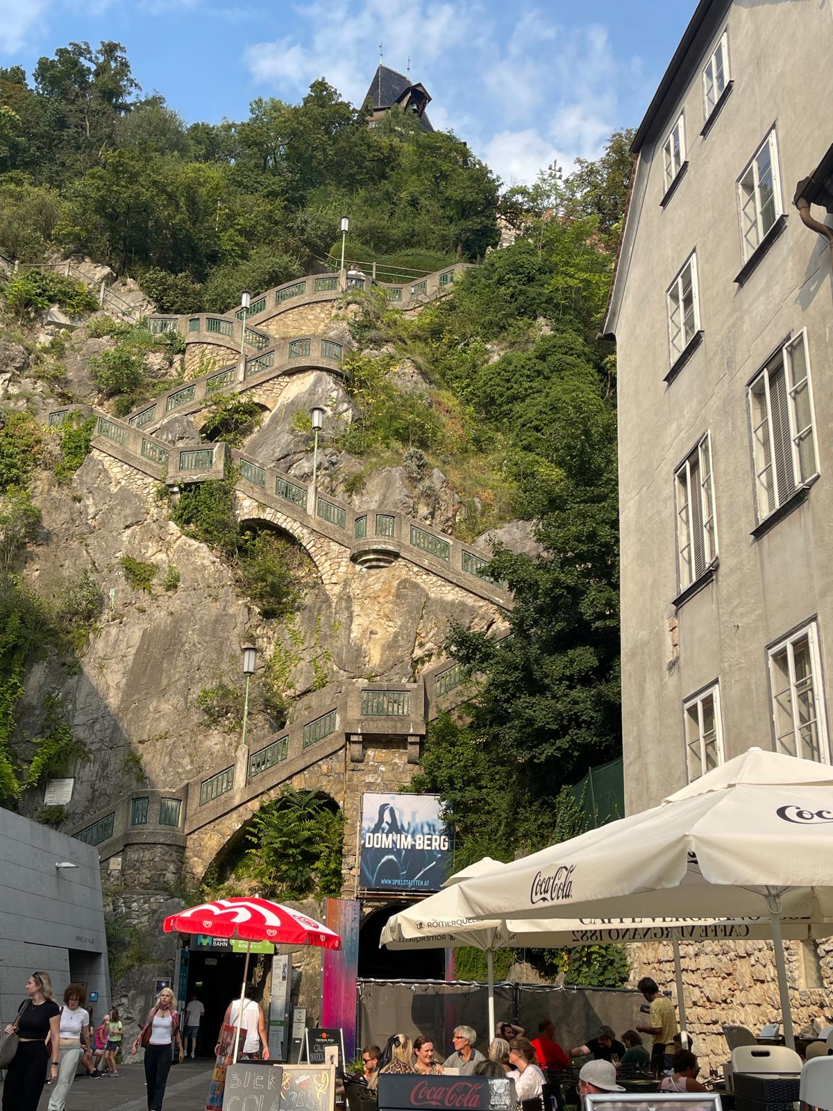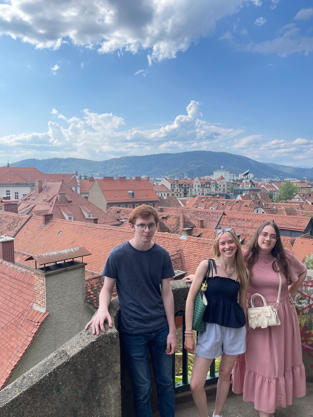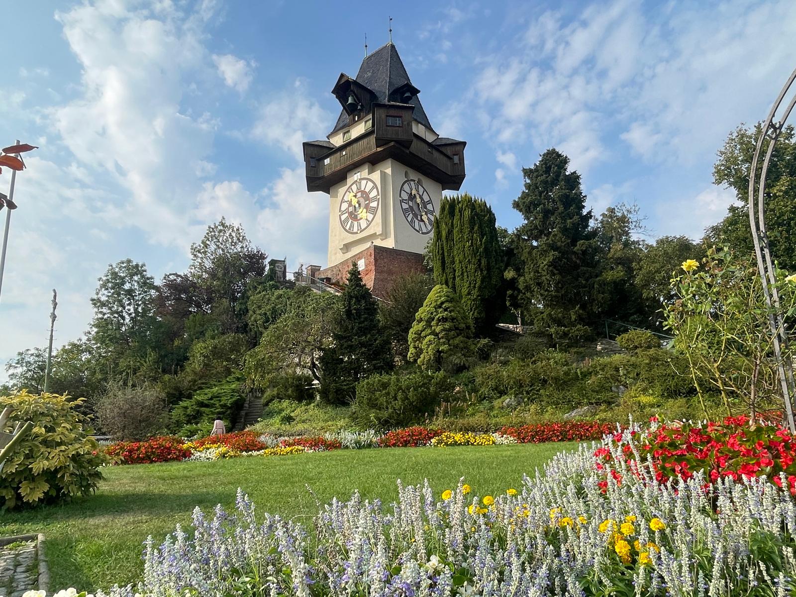 Gemeinsam mit ihrer Ausbilderin Beatrix Schorn und Wohngruppenbetreuer Stefan Seffrin haben sich Dominik, Franziska, Julia und Philipp am frühen Morgen des 24. August per Bahn auf den Weg nach Österreich gemacht. Nach der langen Anreise stand der Sonntag erstmal im Zeichen des Ausschlafens und des Stadterkundens: ein Bummel durch die Altstadt und natürlich ein Spaziergang hoch zum Schlossberg, von wo aus man einen wunderschönen Blick über Graz hat. Auf dem Schloßberg befindet sich auch der Grazer Uhrturm mit seinen über 5 Meter großen Ziffern und den vergoldeten Zeigern, das Wahrzeichen der steirischen Landeshauptstadt.
