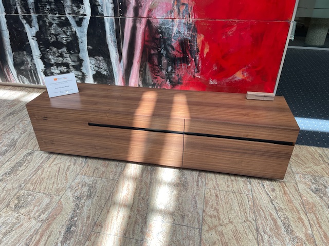 Dominik hat sein Lowboard speziell für die Aufbewahrung von Spielekonsolen und Zubehör entworfen. Es kann wahlweise klassisch mit einem Sockel auf dem Boden stehen oder mittels Hängeleisten an der Wand befestigt werden. Der Korpus besteht aus Spanplatten, die mit amerikanischem Nussbaum furniert wurden. Dieses Holzfurnier verleiht mit seiner dunklen Maserung einen warmen Charakter. Im Gegensatz dazu bildet der Sockel aus schwarzem MDF einen wirkungsvollen Kontrast. Hinter der linken Klappe befindet sich ein handgezinkter Schubkasten und hinter der rechten Klappe ein Fach mit eingelegtem Glasboden. Alle Oberflächen wurden mit einem widerstandsfähigen 2-Komponenten-Lack behandelt, der nicht nur optimalen Schutz vor Kratzern und Abnutzung bietet, sondern auch die natürliche Schönheit des Nussbaumfurniers erhält.